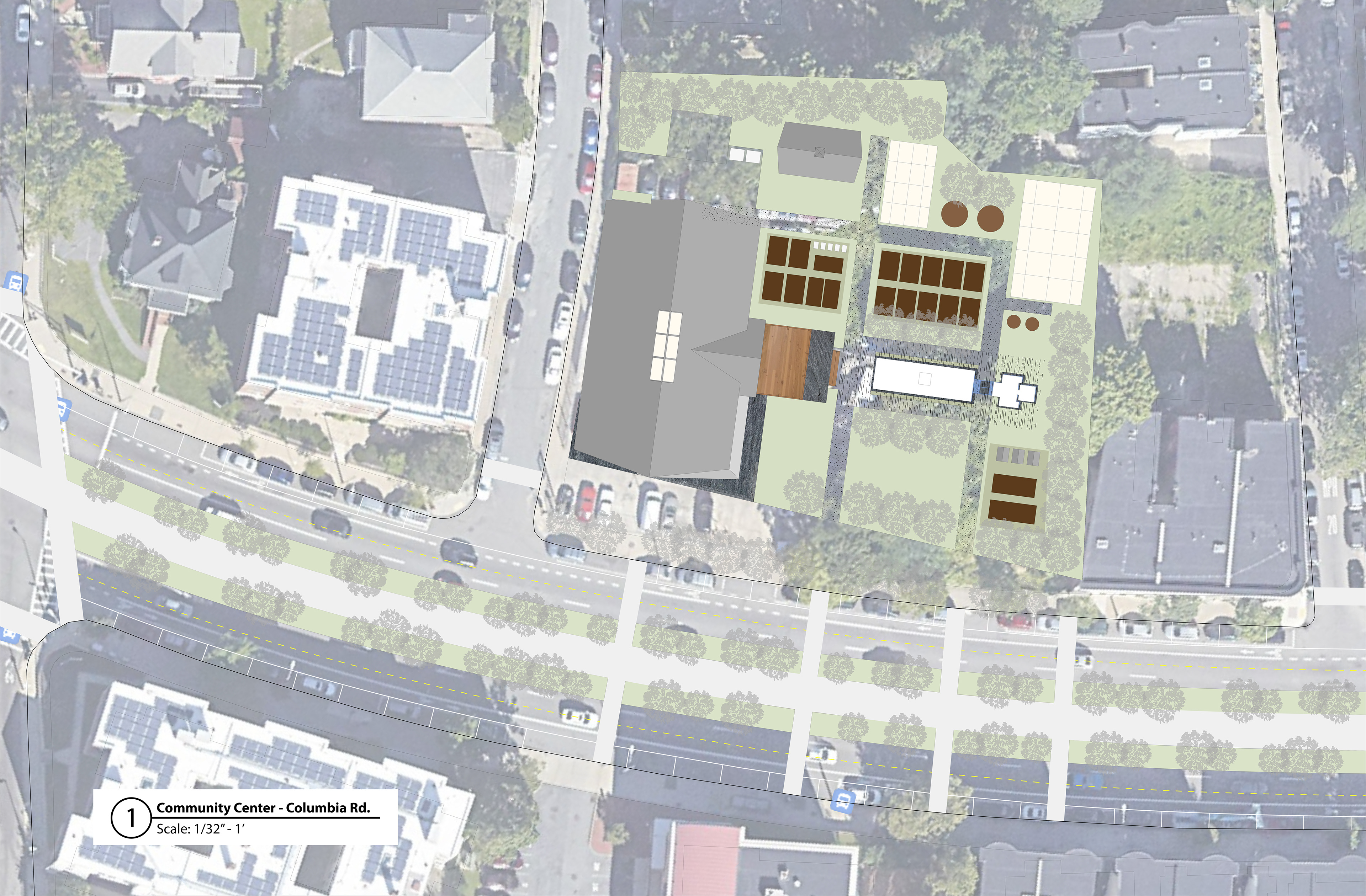 Supporting a vision of knitting together neighborhoods, by providing families and children a safer and easier access to open spaces, “Dorchesterway” proposes a 4 lane road divided by a protected nature pathway where its currently occupied by a hefty concrete median. Along “Dorchesterway”, Olmsted’s vision of connecting parks with parkways is embodied thru creating pockets of open spaces along Columbia Rd. With the intention of increasing levels of CO2 and reducing our concrete footprint in Boston, through the power of eminent domain, “Dorchesterway” would turn vacant buildings and parking lots into various programs.
